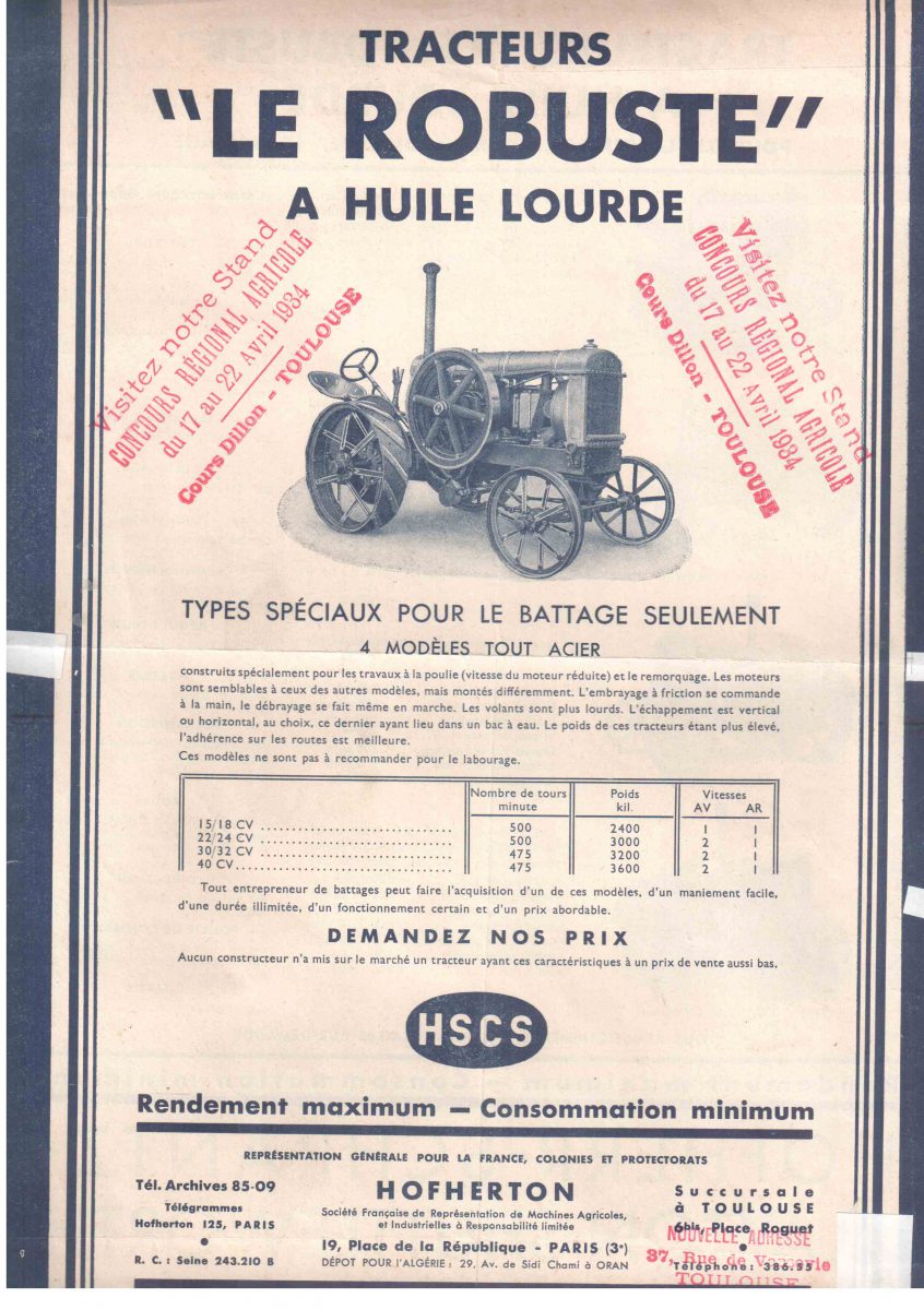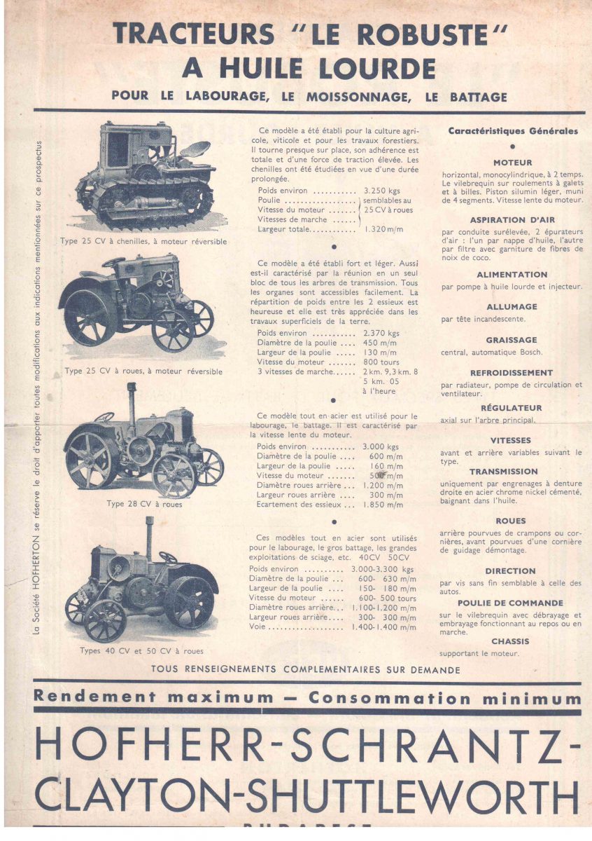El tractor HSCS “Le Robuste”, fue fabricado entre 1925 y 1937 y se impulsaba con un motor diésel de dos tiempos monocilíndrico de 9,530 litros que entregaba 40 HP a 600 rpm.