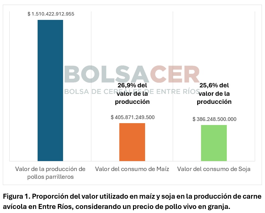 La producción de pollos parrilleros requiere del uso de maíz y soja como insumos para la alimentación de las aves. En el caso entrerriano, para el total de dicha producción, en 2024 se utilizaron 1.919.013 toneladas de maíz y 1.170.450 toneladas de soja, de acuerdo con las estimaciones realizadas. Actualmente, considerando el precio pizarra para el día 25/2/2025, el valor del maíz utilizado es de $ 405.871.249.500, y el valor de la soja utilizada es de $ 386.248.500.000.