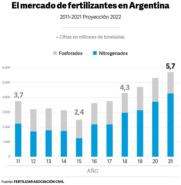 En 2021 se utilizaron 400 millones de toneladas de fertilizantes entre los nitrogenados, fosforados y potásicos. Argentina representa solamente un 1,4% de este segmento, teniendo en cuenta que casi ni se utilizan los potásicos en el país. Fuente: Clarín