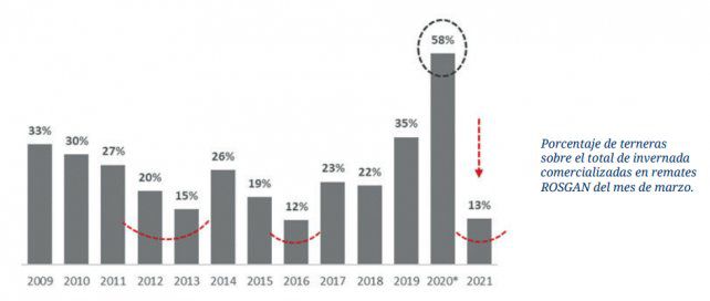Una de ellas es la menor oferta de terneras que se está viendo en este inicio de zafra. Si analizamos la participación de terneras sobre el total de lotes de terneros/as de invernada ingresados en los diferentes remates del mes de marzo de Rosgan, surge un indicador sumamente elocuente. El 2020 se descarta del análisis por tratarse de un remate ocurrido durante los primeros días de abril y en un contexto donde seguramente se mezclen diferentes factores que pueden sesgar la interpretación. Sin embargo, comparando con los ciclos previos, la participación de terneras sobre el total de invernada (terneros, terneras y lotes mixtos) subastados en los dos remates del mes de marzo alcanza un escaso 13%, en total consistencia con los porcentajes registrados en períodos asociados a fases de retención.