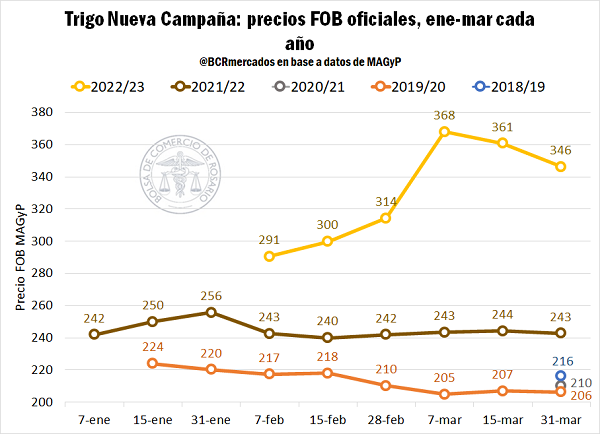 El ritmo de negocios de exportación subió notablemente respecto de anteriores campañas, debido precisamente a la coyuntura internacional que sostienen los precios del cereal. A propósito de los precios, tenemos que los FOB para el trigo 2022/23 argentino durante marzo estuvieron un 58% por encima del promedio en las últimas 4 campañas.