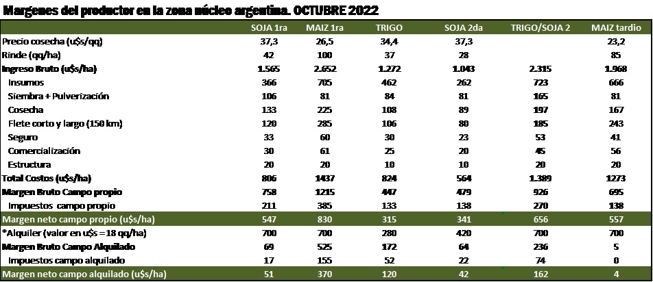 (* Precios actualizados el 18/10/2022. Costo de alquiler bruto sin deducciones impositivas prorrateado para un doble cultivo. Escenarios productivos posibles para un sistema agrícola de nivel tecnológico promedio)