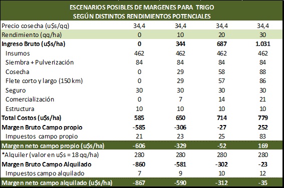 «En el mejor sector de GEA, donde llovió mejor y el efecto de las heladas no fue tan grave, en la zona de El Trébol, el rinde promedio zonal rondaría los 30 qq/ha. Pero incluso allí habrá pérdidas: bajo la condición de campo alquilado la rentabilidad será negativa con una pérdida de 35 u$s/ha», concluyeron los técnicos.