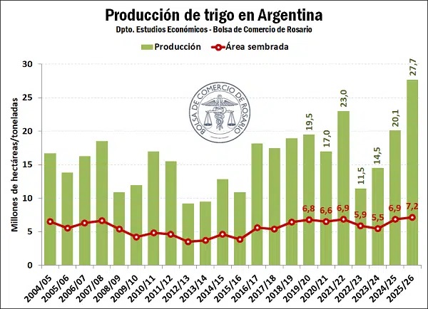 A esto se sumó una superficie sembrada que, sin ser récord absoluto, alcanzó el nivel más alto de los últimos 29 años, configurando una oferta inédita para la cadena triguera.