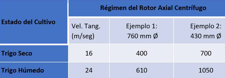 El régimen está definido por la velocidad tangencial del rotor. Por este motivo, según el modelo de máquina y el diámetro de su rotor o cilindro, el régimen óptimo para una condición de cultivo no será igual para todas las máquinas. A modo de ejemplo, se puede ver en la tabla hecha por técnicos de INTA la relación entre los mencionados parámetros. Un rotor de mayor diámetro requiere menor régimen de giro para trabajar con la misma velocidad tangencial que uno de menor diámetro.