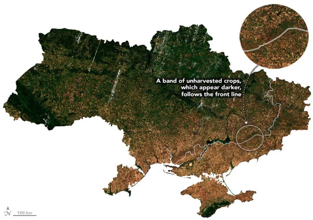 Las imágenes satelitales muestran una franja sin cultivar en las zonas cercanas al frente de guerra.