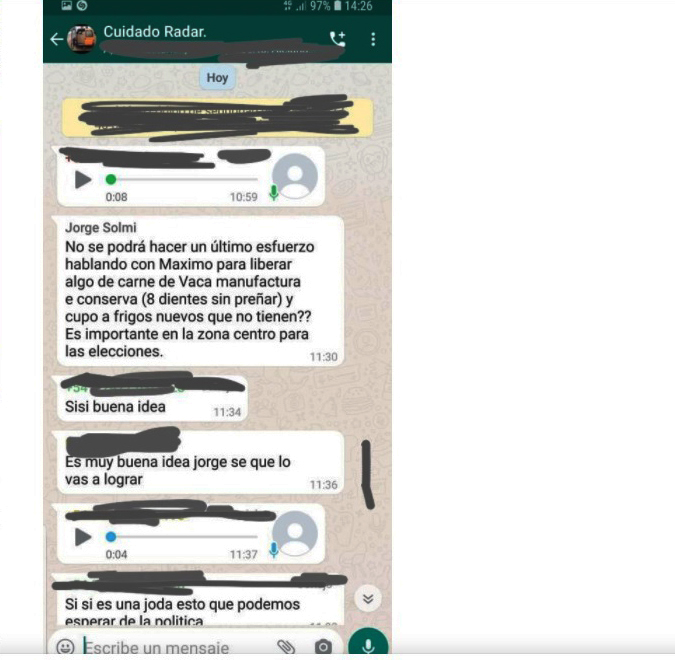 «Del modo más absurdo, con un mensaje de WhatsApp enviado por error a un grupo de productores, el secretario de Agricultura, Jorge Solmi, confirmó que es casi un hecho la continuidad del cepo a la carne. Y lo que es peor: dio a entender que no es decisión de ningún funcionario del Poder Ejecutivo sino de Máximo Kirchner, el diputado e hijo de la vicepresidenta Cristina Kirchner».