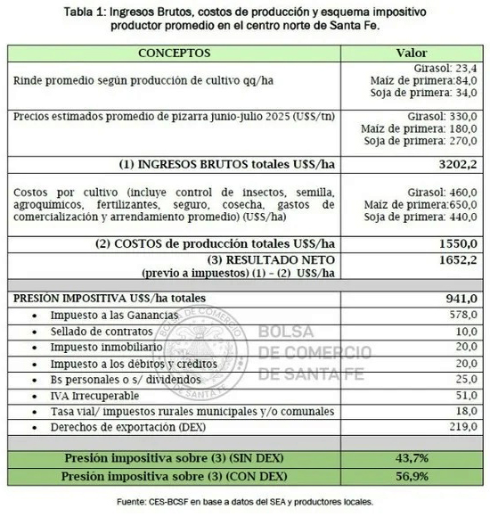 Al 31 de julio de 2025, «un productor agropecuario promedio de la provincia de Santa Fe enfrenta una carga impositiva que ronda el 43,7% de sus ingresos. Al computar las retenciones a las exportaciones esta carga asciende al 56,9%, a pesar de la reducción parcial de los derechos de exportación. De dicha cifra, más de la mitad se destina a las arcas del Gobierno Nacional».
