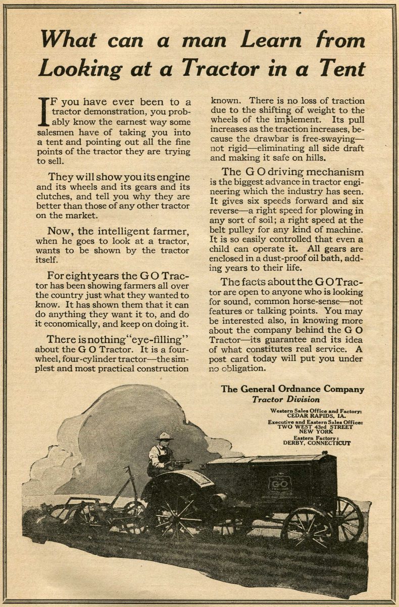 Cuenta la historia que la empresa General Ordnance Company of America fue un fabricante de armamento fundado en el siglo XIX. La sede de la empresa estaba en Nueva York y con la compra de la empresa de Iowa hizo un intento de fabricar tractores.