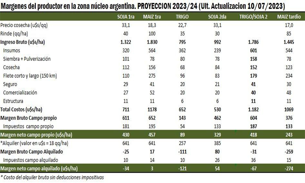 El rinde de indiferencia para este planteo es de 99 quintales por hectárea. Es decir que el productor necesita obtener ese rinde para comenzar a ganar en campo alquilado, cuando el promedio para la región núcleo de los últimos 10 años (sin contar el último) es de 94,8 quintales por hectárea.